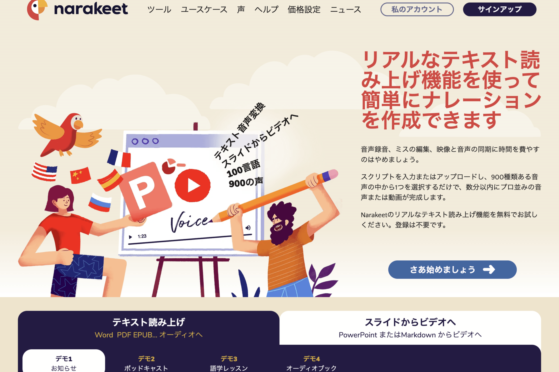 Narakeetは、“音声を作る”だけでなく、“ナレーション付き動画まで作る”方向に強いサービスです。公式の言語ページでは、108言語・914音声に対応し、登録なしで始められることが案内されています。さらにトップページでは、100言語・900音声でナチュラルなTTSとナレーション付き動画作成を打ち出しています。PowerPointの発表者ノートに台本を書いてナレーション付き動画を作る使い方もドキュメントに掲載されています。