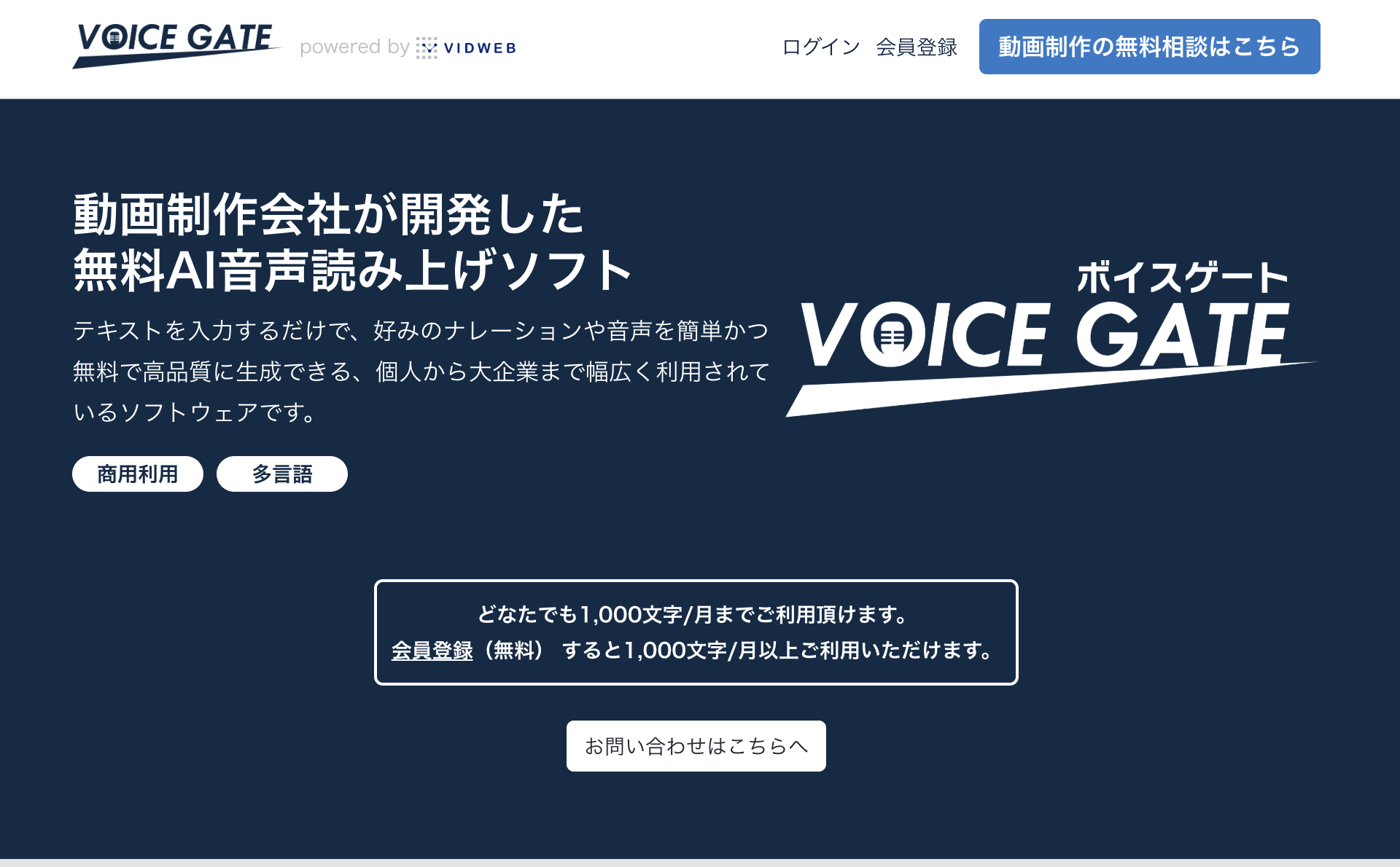 VOICE GATEは、「まず試す」ための入口としてかなり強いサービスです。公式ページでは、最新の音声合成技術による自然な音声、複数言語や音声タイプへの対応、そして無料提供・ダウンロード・商用利用可能を訴求しています。