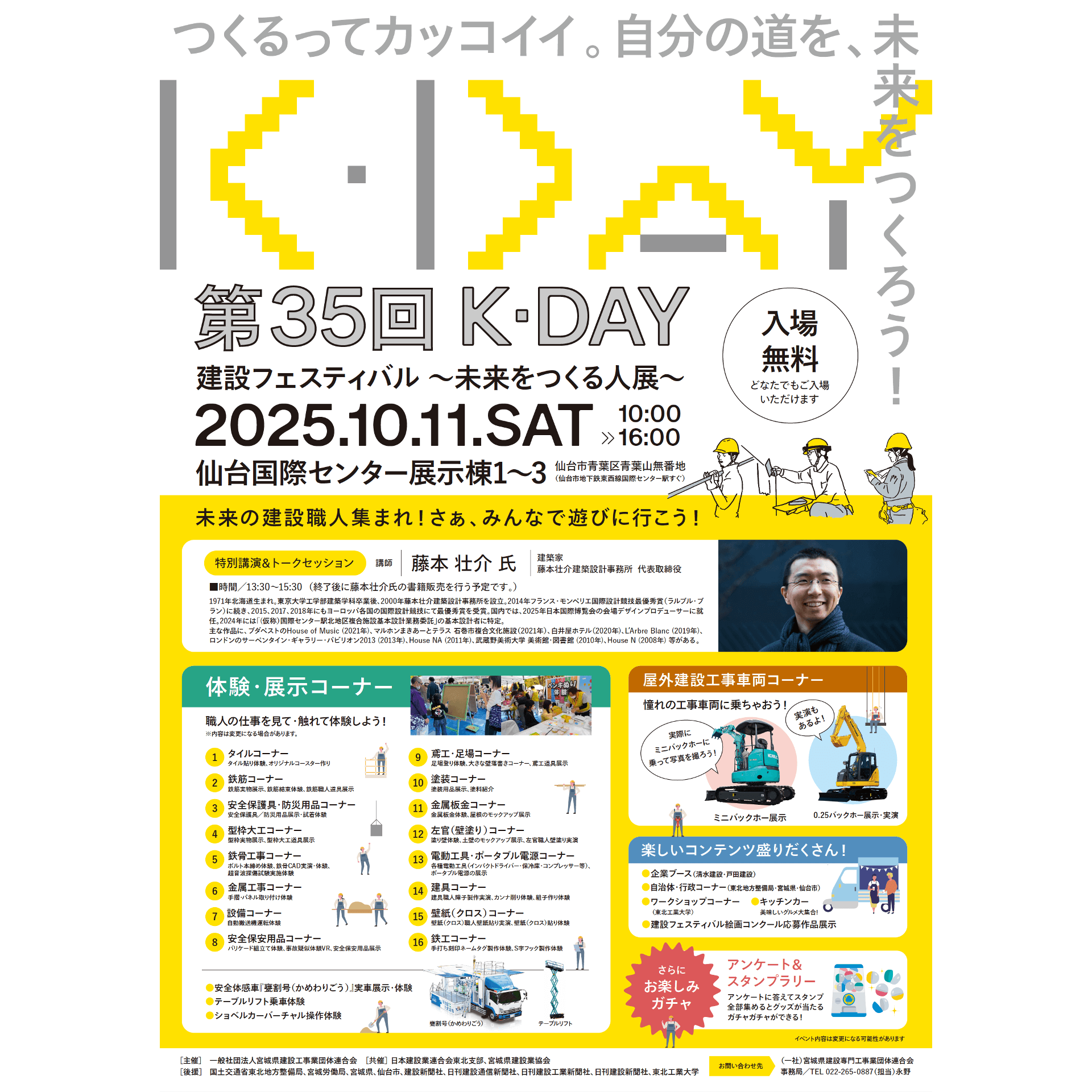 一般社団法人 宮城県建設専門工事業団体連合会が主催するイベント「第35回 K・DAY 建設フェスティバル~未来をつくる人展~」が2025年10月11日(土)に仙台国際センター展示棟にて開催されます。