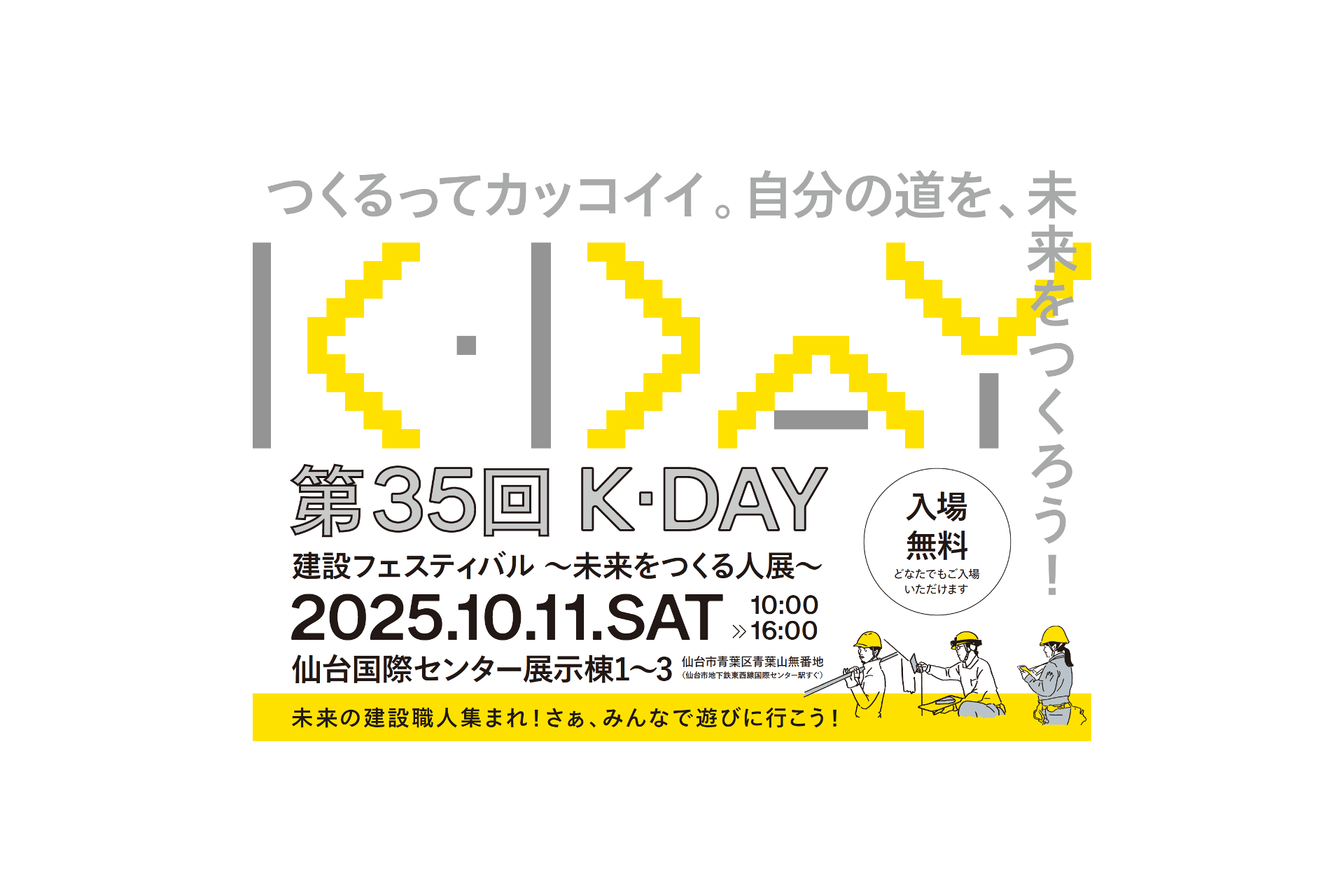 一般社団法人 宮城県建設専門工事業団体連合会が主催するイベント「第35回 K・DAY 建設フェスティバル~未来をつくる人展~」が2025年10月11日(土)に仙台国際センター展示棟にて開催されます。
